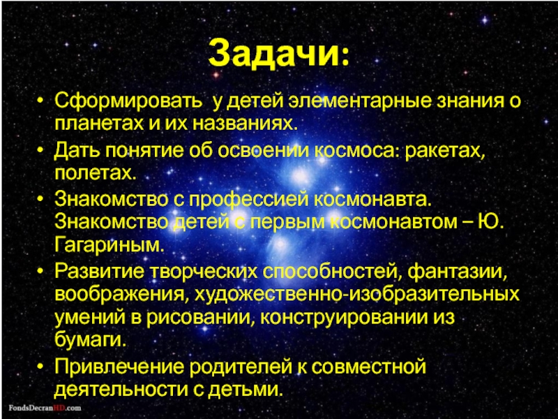 Задачи:Сформировать у детей элементарные знания о планетах и их названиях.Дать понятие об освоении космоса: ракетах, полетах.Знакомство с
