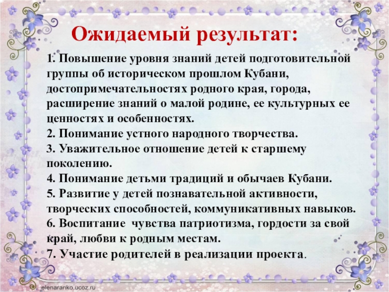Слайд 61. Повышение уровня знаний детей подготовительной группы об историческом прошлом Кубани,