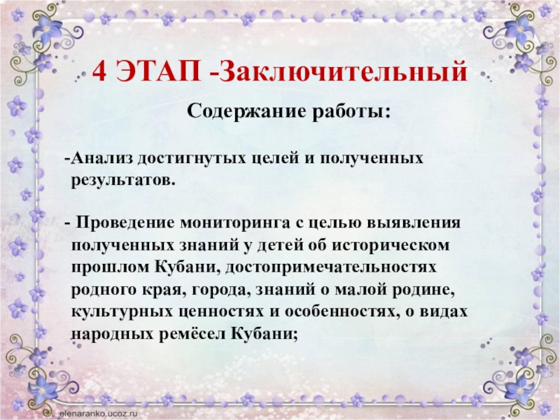 мониторинга с целью выявления полученных знаний у детей об историческом прошлом Кубани, достопримечательностях родного края, города, знаний о малой родине, культурных ценностях и особенностях, о видах народных ремёсел Кубани;
