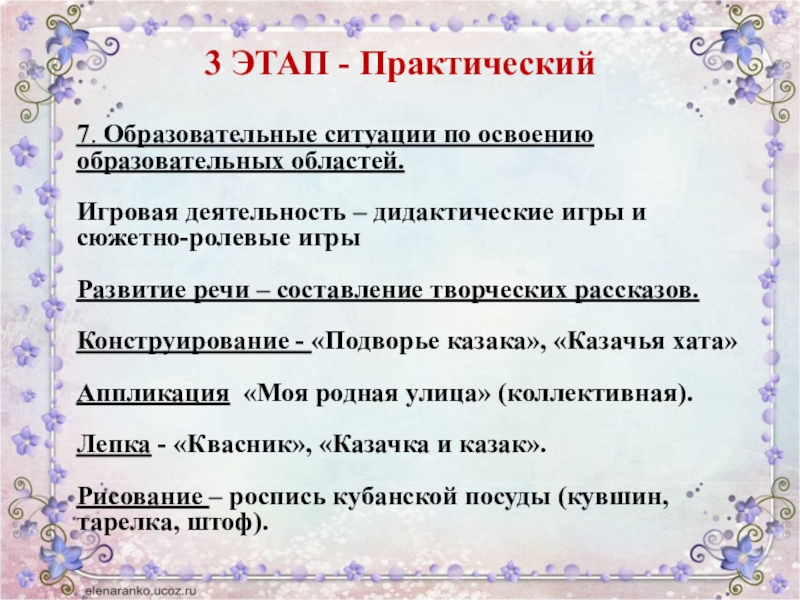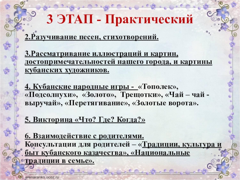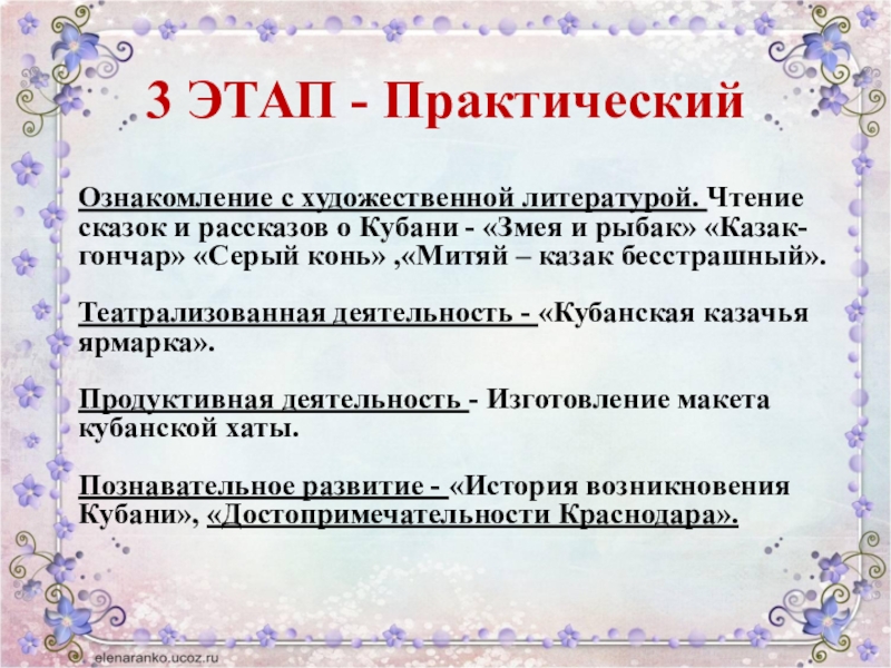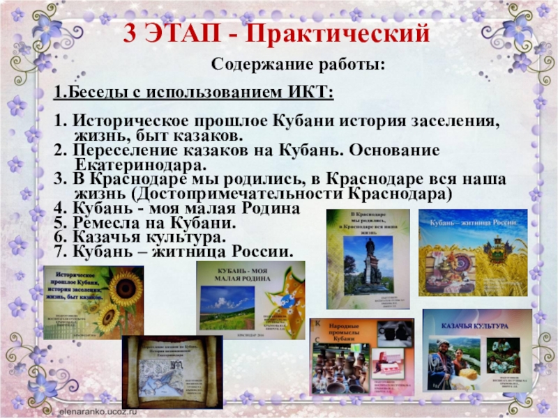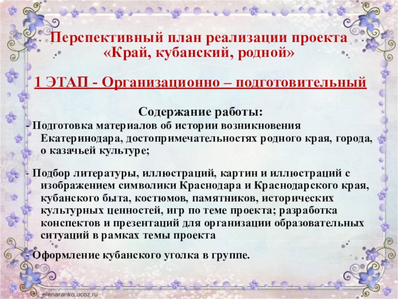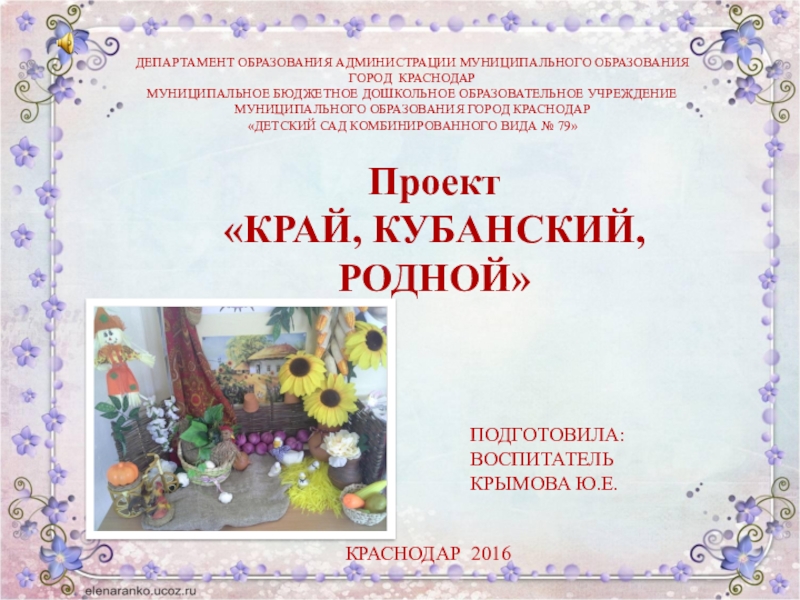 - Подбор литературы, иллюстраций, картин и иллюстраций с изображением символики Краснодара и Краснодарского края, кубанского быта, костюмов, памятников, исторических культурных ценностей, игр по теме проекта; разработка конспектов и презентаций для организации образовательных ситуаций в рамках темы проекта