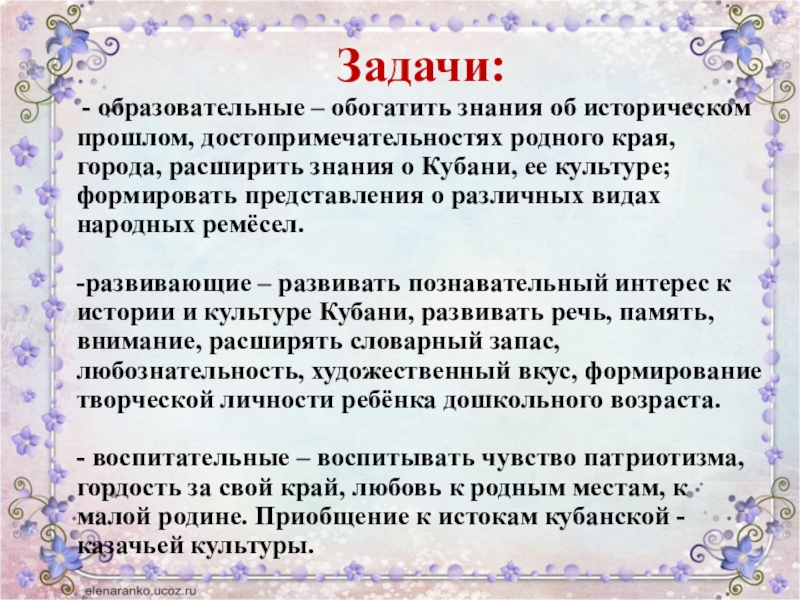 - воспитательные – воспитывать чувство патриотизма, гордость за свой край, любовь к родным местам, к малой родине. Приобщение к истокам кубанской - казачьей культуры.