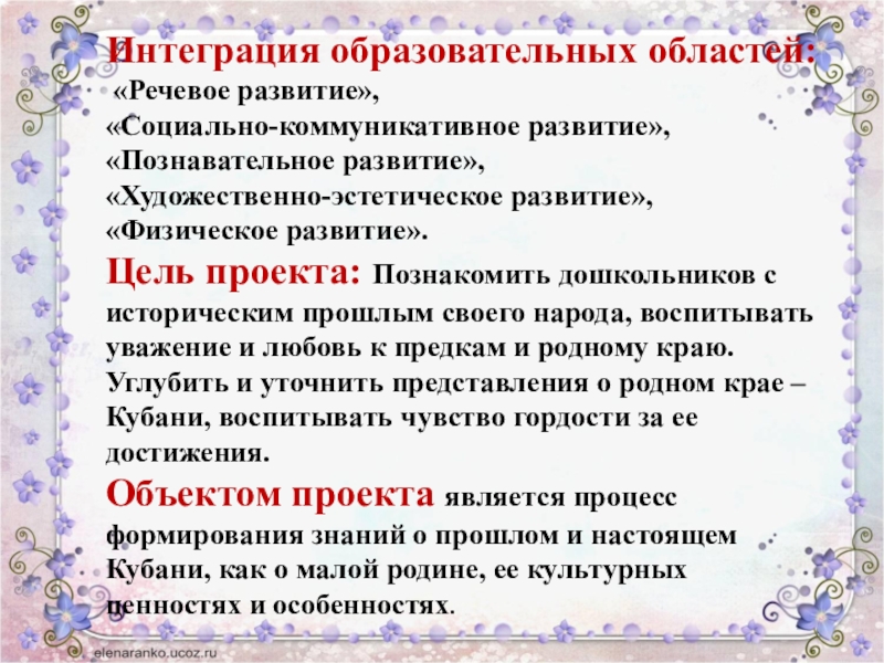 Объектом проекта является процесс формирования знаний о прошлом и настоящем Кубани, как о малой родине, ее культурных ценностях и особенностях.