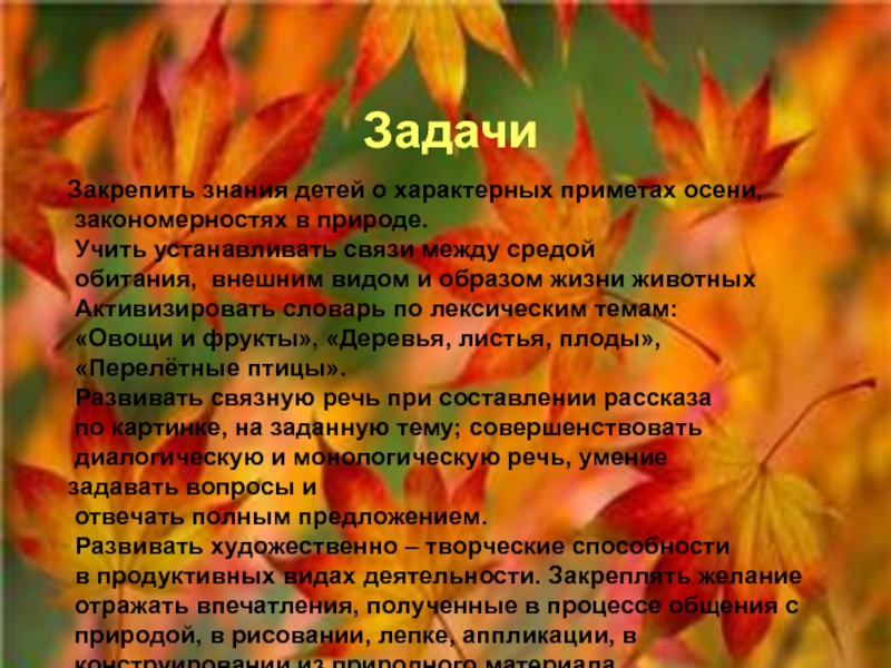 Закрепить знания детей о характерных приметах осени,
