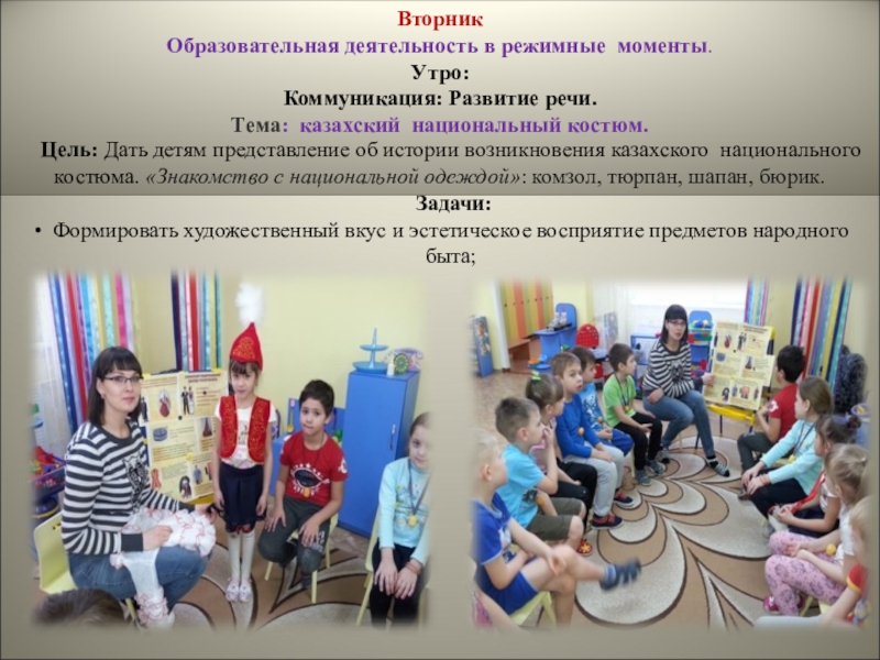 представление об истории возникновения казахского национального костюма. «Знакомство с национальной одеждой»: комзол, тюрпан, шапан, бюрик.