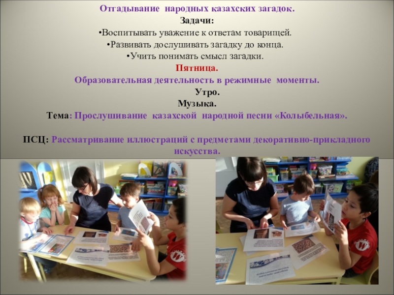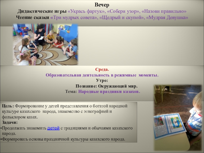 Цель: Формирование у детей представления о богатой народной культуре казахского народа, знакомство с этнографией и фольклором казах.