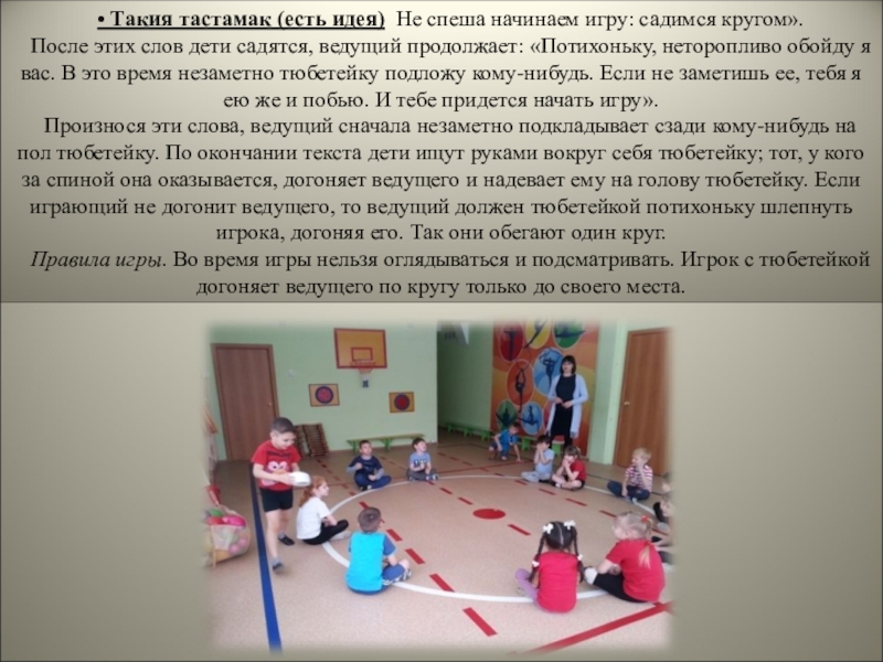 Слайд 10• Такия тастамак (есть идея) Не спеша начинаем игру: садимся кругом».