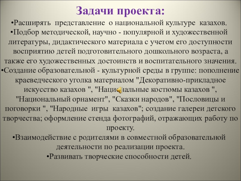Цель проекта: Познакомить детей с традициями казахского народа.