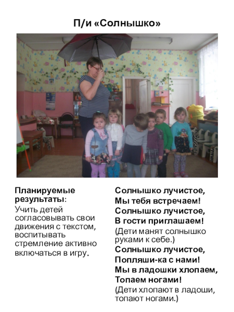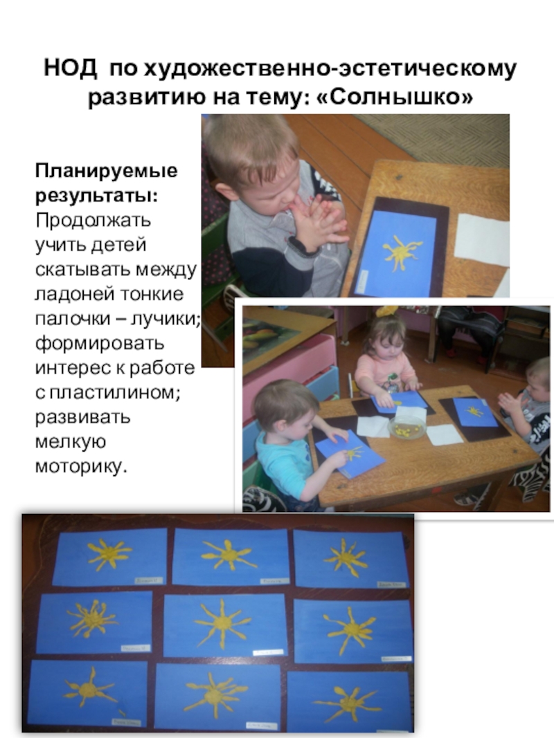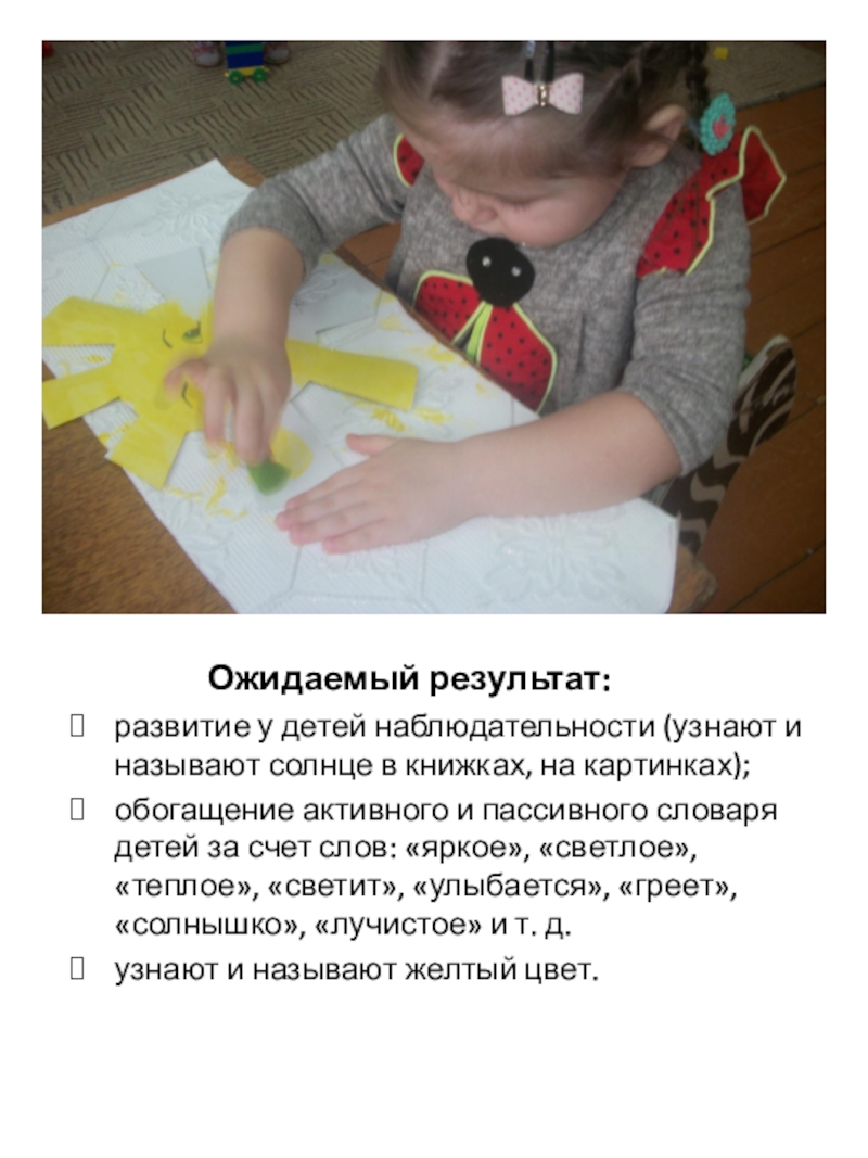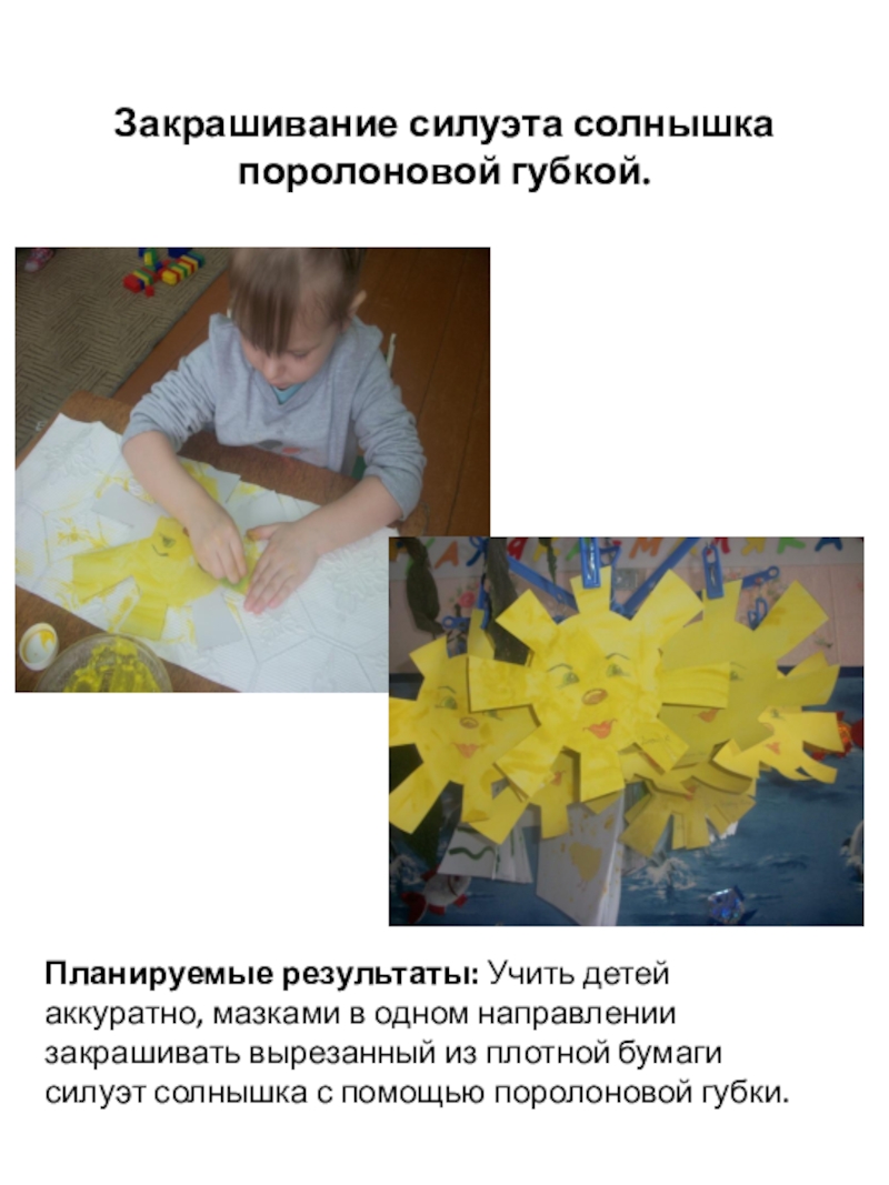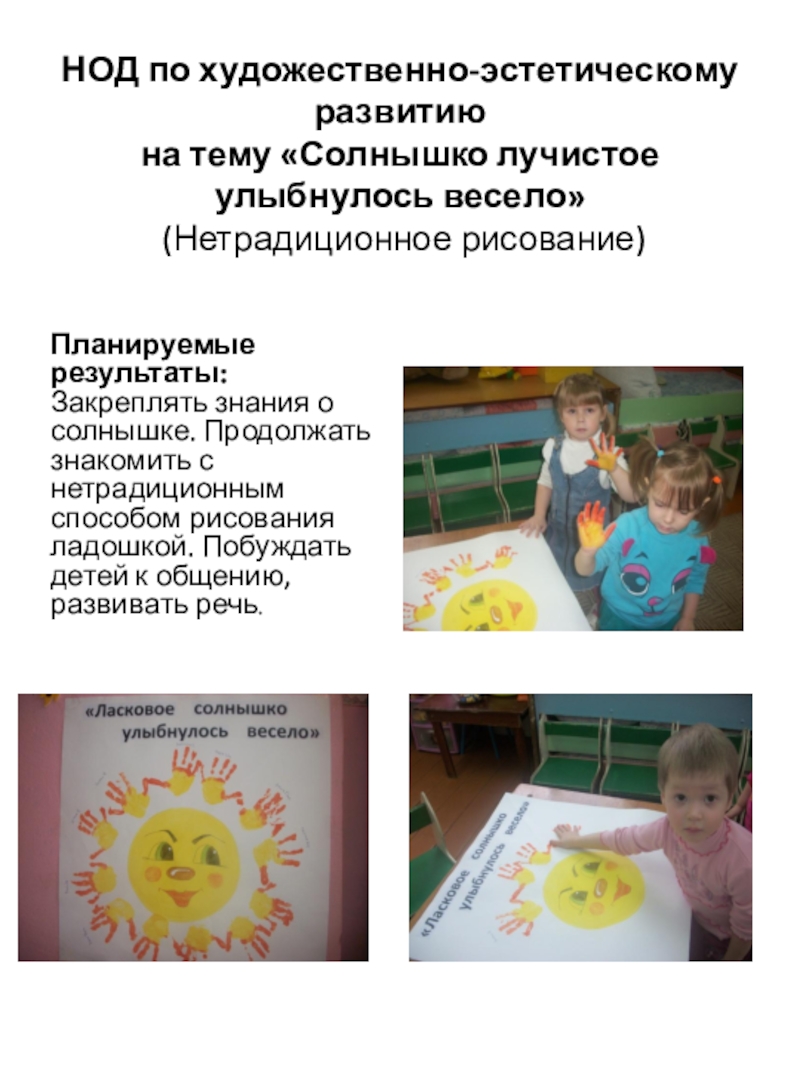 Планируемые результаты: Закреплять знания о солнышке. Продолжать знакомить с нетрадиционным способом рисования ладошкой. Побуждать детей к общению, развивать речь.