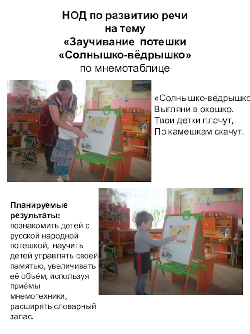 Планируемые результаты: познакомить детей с русской народной потешкой, научить детей управлять своей памятью, увеличивать её объём, используя приёмы мнемотехники, расширять словарный запас.