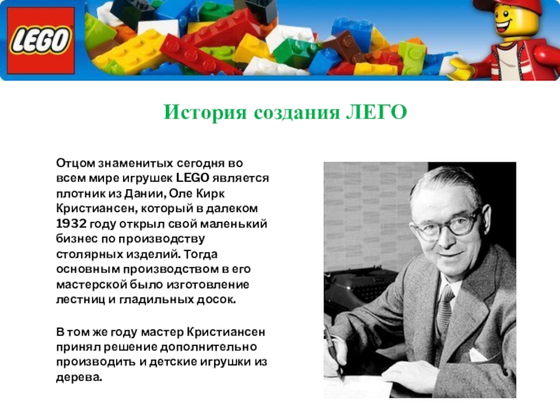 плотник из Дании, Оле Кирк Кристиансен, который в далеком 1932 году открыл свой маленький бизнес по производству столярных изделий. Тогда основным производством в его мастерской было изготовление лестниц и гладильных досок.
