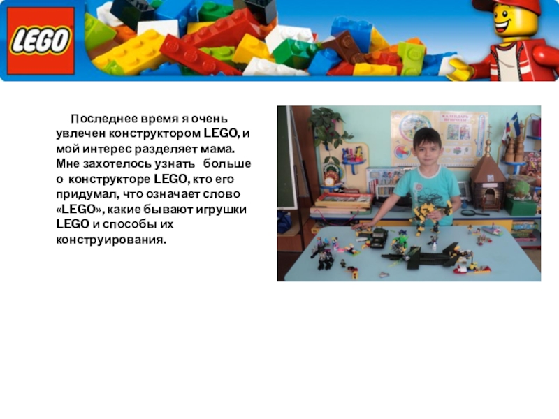 мой интерес разделяет мама. Мне захотелось узнать больше о конструкторе LEGO, кто его придумал, что означает слово «LEGO», какие бывают игрушки LEGO и способы их конструирования.