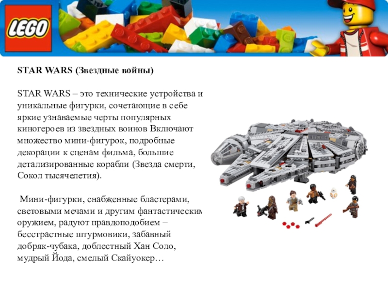 фигурки, сочетающие в себе яркие узнаваемые черты популярных киногероев из звездных воинов Включают множество мини-фигурок, подробные декорации к сценам фильма, большие детализированные корабли (Звезда смерти, Сокол тысячелетия).