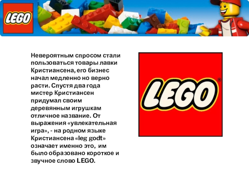 но верно расти. Спустя два года мистер Кристиансен придумал своим деревянным игрушкам отличное название. От выражения «увлекательная игра», - на родном языке Кристиансена «leg godt» означает именно это, им было образовано короткое и звучное слово LEGO.