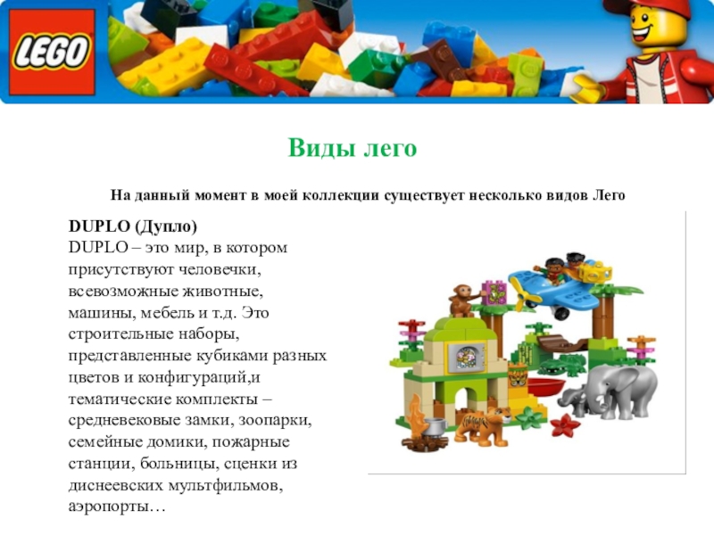 DUPLO – это мир, в котором присутствуют человечки, всевозможные животные, машины, мебель и т.д. Это строительные наборы, представленные кубиками разных цветов и конфигураций,и тематические комплекты – средневековые замки, зоопарки, семейные домики, пожарные станции, больницы, сценки из диснеевских мультфильмов, аэропорты…