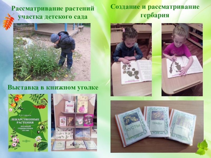 -чтение и рассматривание книг и иллюстраций в книжном уголке о растениях