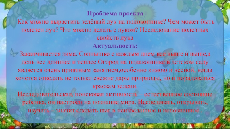 Заканчивается зима. Солнышко с каждым днем все выше и выше,а день все длиннее и теплее.Огород на подаконнике в детском саду является очень приятным занятием,особенно зимою и весной, когда хочется отведать не только свежие дары прирноды, но и порадоваться краскам зелени.