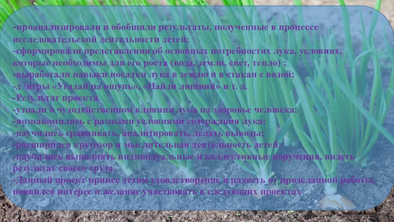 -выработали навыки посадки лука в землю и в стакан с водой;