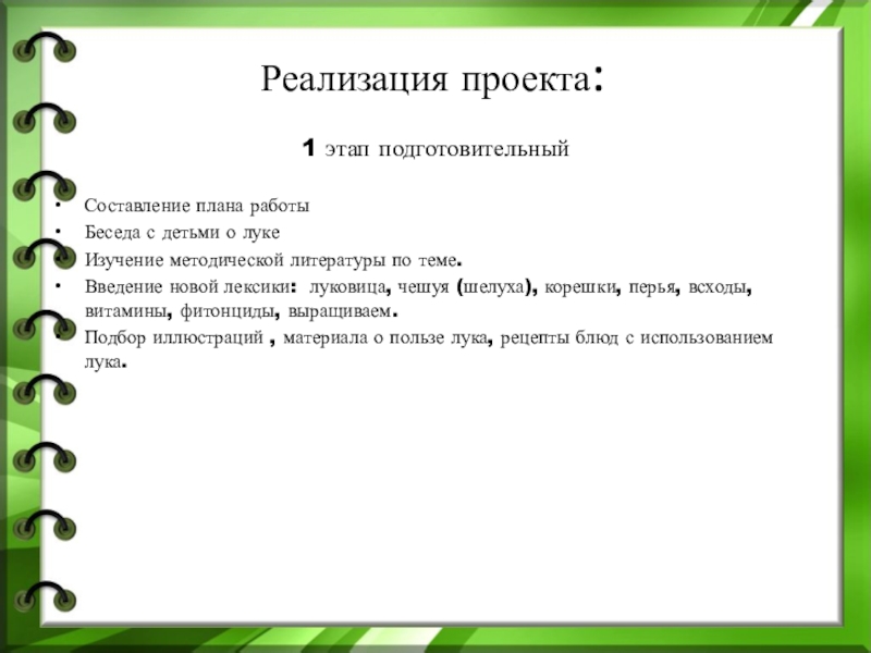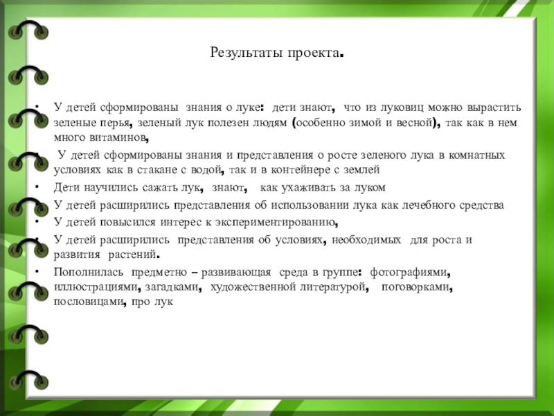 Проведя с детьми беседу, выявили, что у детей недостаточно развиты знания о луке. Дети знают что лук – обязательная приправа супов, котлет и разных других мясных, рыбных и овощных блюд, лук богат витаминами. Дети обладают небольшим запасом знаний о выращивании лука и его полезных свойствах.