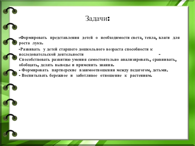 -Развивать у детей старшего дошкольного возраста способности к исследовательской деятельности -Способствовать развитию умения самостоятельно анализировать, сравнивать, обобщать, делать выводы и применять знания. - Формировать партнерские взаимоотношения между педагогом, детьми. - Воспитывать бережное и заботливое отношение к растениям.