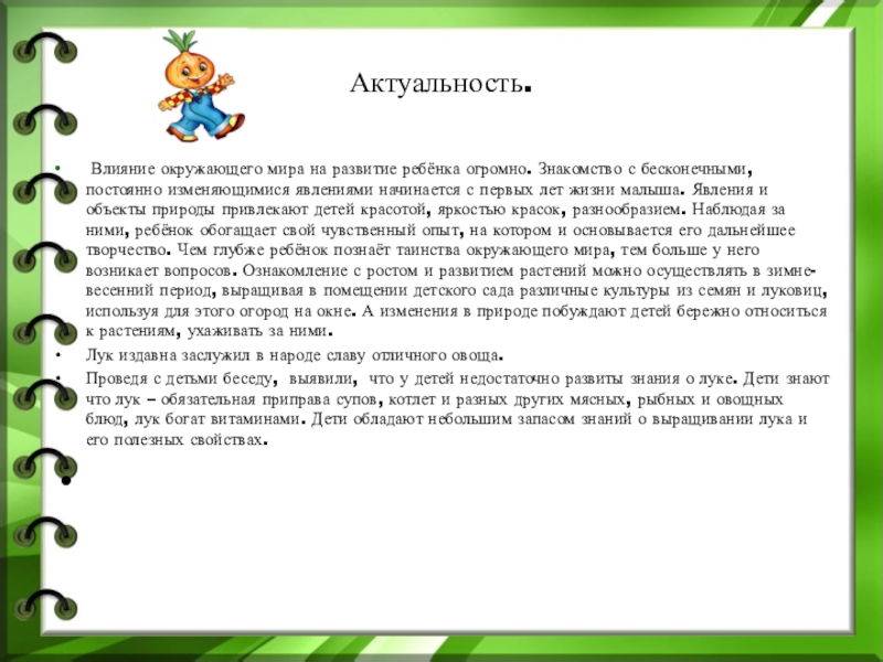 постоянно изменяющимися явлениями начинается с первых лет жизни малыша. Явления и объекты природы привлекают детей красотой, яркостью красок, разнообразием. Наблюдая за ними, ребёнок обогащает свой чувственный опыт, на котором и основывается его дальнейшее творчество. Чем глубже ребёнок познаёт таинства окружающего мира, тем больше у него возникает вопросов. Ознакомление с ростом и развитием растений можно осуществлять в зимне-весенний период, выращивая в помещении детского сада различные культуры из семян и луковиц, используя для этого огород на окне. А изменения в природе побуждают детей бережно относиться к растениям, ухаживать за ними.