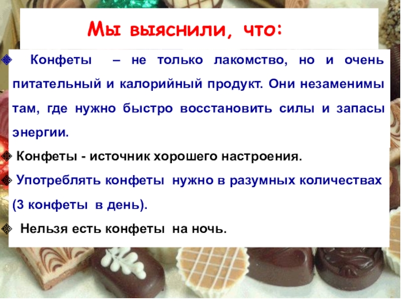 Употреблять конфеты нужно в разумных количествах (3 конфеты в день).