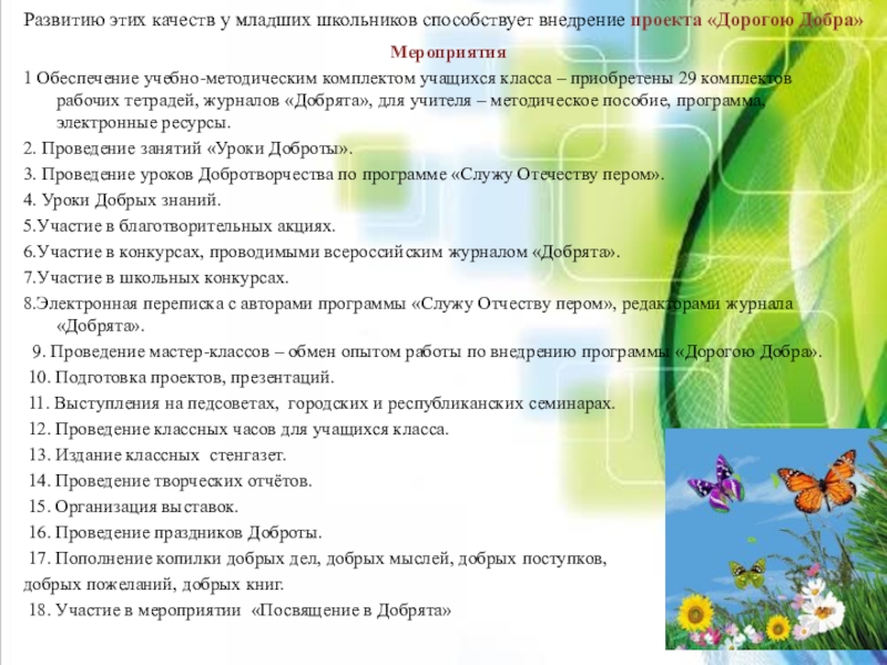 Слайд 19Развитию этих качеств у младших школьников способствует внедрение проекта «Дорогою Добра»