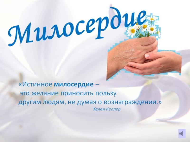 Слайд 7Милосердие – сострадательное, доброжелательное, заботливое, любовное отношение к другому человеку.
