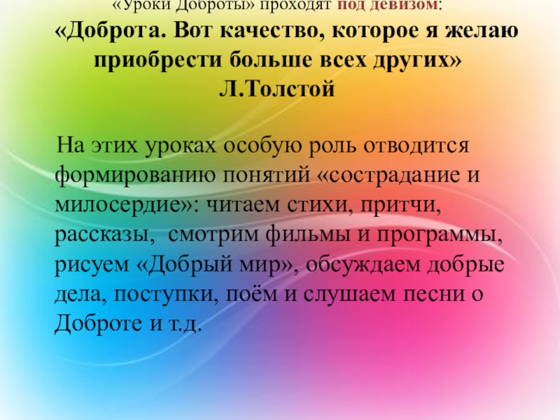 На этих уроках особую роль отводится формированию понятий «сострадание и милосердие»: читаем стихи, притчи, рассказы, смотрим фильмы и программы, рисуем «Добрый мир», обсуждаем добрые дела, поступки, поём и слушаем песни о Доброте и т.д.