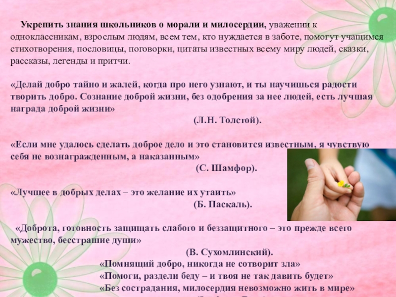 одноклассникам, взрослым людям, всем тем, кто нуждается в заботе, помогут учащимся стихотворения, пословицы, поговорки, цитаты известных всему миру людей, сказки, рассказы, легенды и притчи.