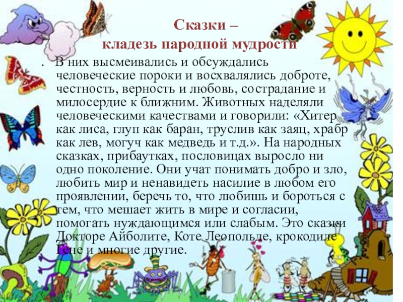 и обсуждались человеческие пороки и восхвалялись доброте, честность, верность и любовь, сострадание и милосердие к ближним. Животных наделяли человеческими качествами и говорили: «Хитер как лиса, глуп как баран, труслив как заяц, храбр как лев, могуч как медведь и т.д.». На народных сказках, прибаутках, пословицах выросло ни одно поколение. Они учат понимать добро и зло, любить мир и ненавидеть насилие в любом его проявлении, беречь то, что любишь и бороться с тем, что мешает жить в мире и согласии, помогать нуждающимся или слабым. Это сказки Докторе Айболите, Коте Леопольде, крокодиле Гене и многие другие.
