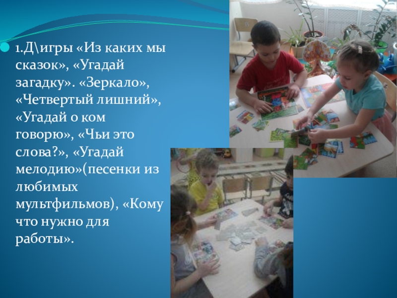 Слайд 161.Д\игры «Из каких мы сказок», «Угадай загадку». «Зеркало», «Четвертый лишний», «Угадай