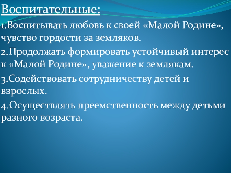 1.Воспитывать любовь к своей «Малой Родине», чувство гордости за земляков.