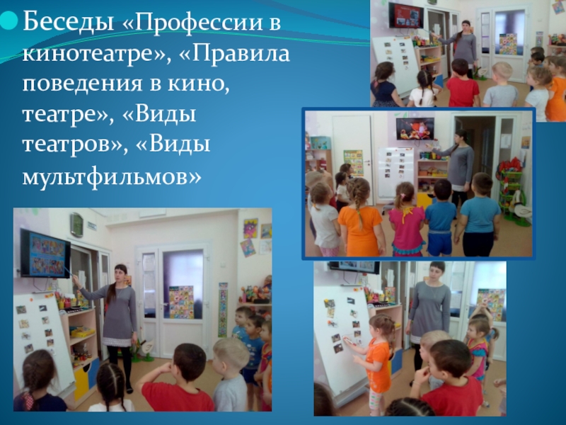 Слайд 15Беседы «Профессии в кинотеатре», «Правила поведения в кино, театре», «Виды театров»,
