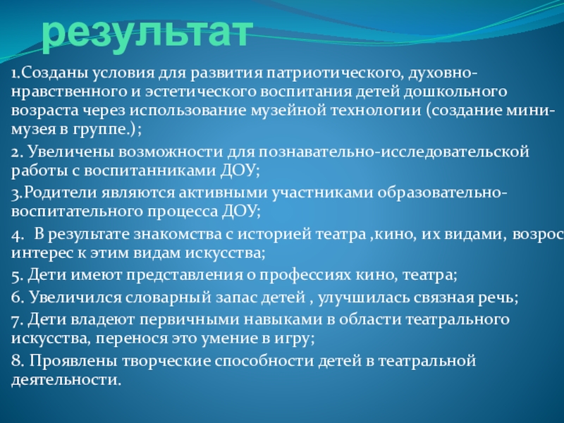 1.Созданы условия для развития патриотического, духовно-нравственного и эстетического воспитания детей