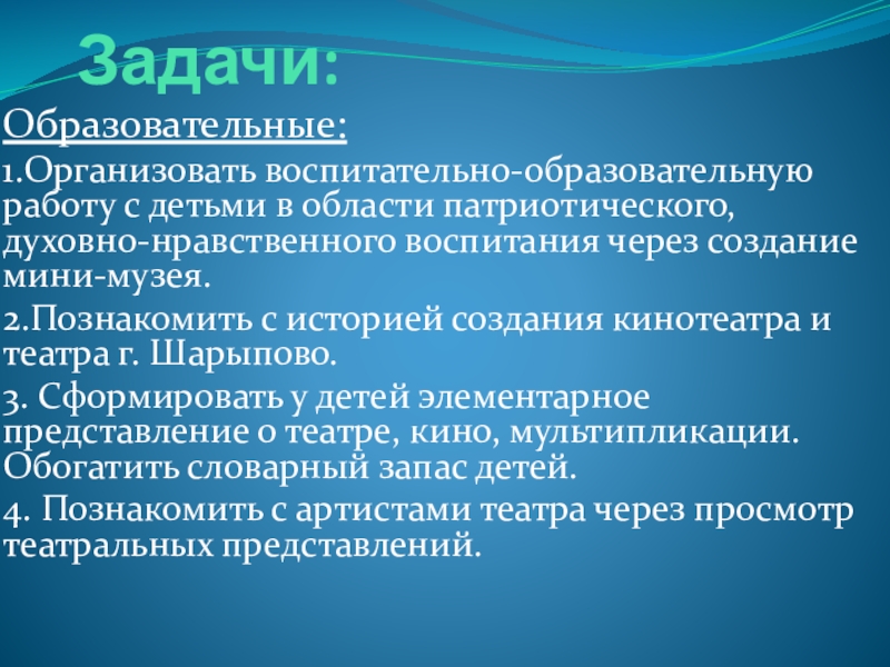 2.Познакомить с историей создания кинотеатра и театра г. Шарыпово.