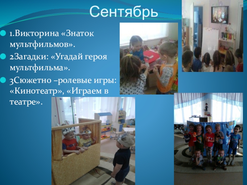 3. Сформировать у детей элементарное представление о театре, кино, мультипликации. Обогатить словарный запас детей.