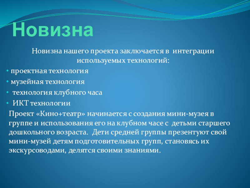 Проект «Кино+театр» начинается с создания мини-музея в группе и использования его на клубном часе с детьми старшего дошкольного возраста. Дети средней группы презентуют свой мини-музей детям подготовительных групп, становясь их экскурсоводами, делятся своими знаниями.
