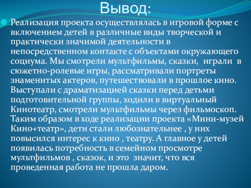 различные виды творческой и практически значимой деятельности в непосредственном контакте с объектами окружающего социума. Мы смотрели мультфильмы, сказки, играли в сюжетно-ролевые игры, рассматривали портреты знаменитых актеров, путешествовали в прошлое кино. Выступали с драматизацией сказки перед детьми подготовительной группы, ходили в виртуальный Кинотеатр, смотрели мультфильмы через фильмоскоп. Таким образом в ходе реализации проекта «Мини-музей Кино+театр», дети стали любознательнее , у них повысился интерес к кино , театру. А главное у детей появилась потребность в семейном просмотре мультфильмов , сказок, и это значит, что вся проведенная работа не прошла даром.