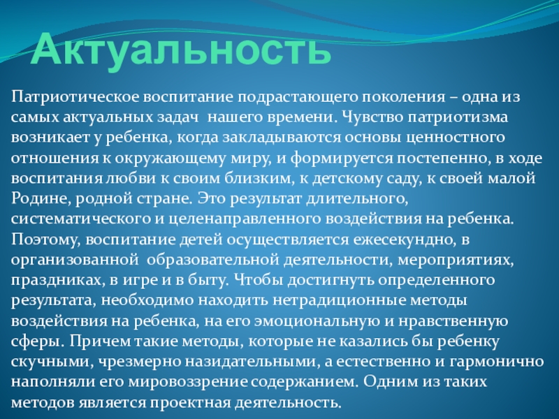 нашего времени. Чувство патриотизма возникает у ребенка, когда закладываются основы ценностного отношения к окружающему миру, и формируется постепенно, в ходе воспитания любви к своим близким, к детскому саду, к своей малой Родине, родной стране. Это результат длительного, систематического и целенаправленного воздействия на ребенка. Поэтому, воспитание детей осуществляется ежесекундно, в организованной образовательной деятельности, мероприятиях, праздниках, в игре и в быту. Чтобы достигнуть определенного результата, необходимо находить нетрадиционные методы воздействия на ребенка, на его эмоциональную и нравственную сферы. Причем такие методы, которые не казались бы ребенку скучными, чрезмерно назидательными, а естественно и гармонично наполняли его мировоззрение содержанием. Одним из таких методов является проектная деятельность.