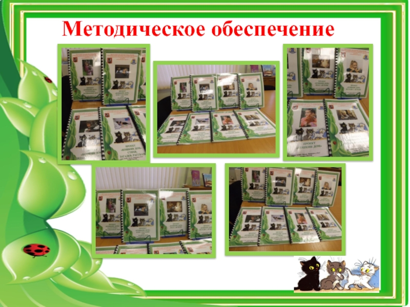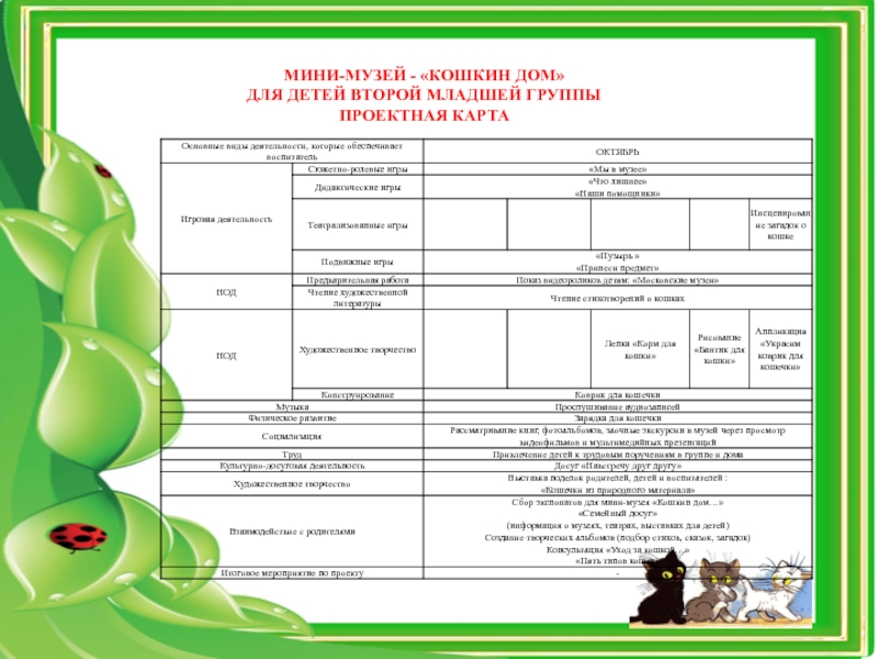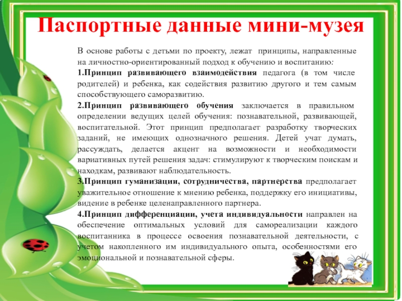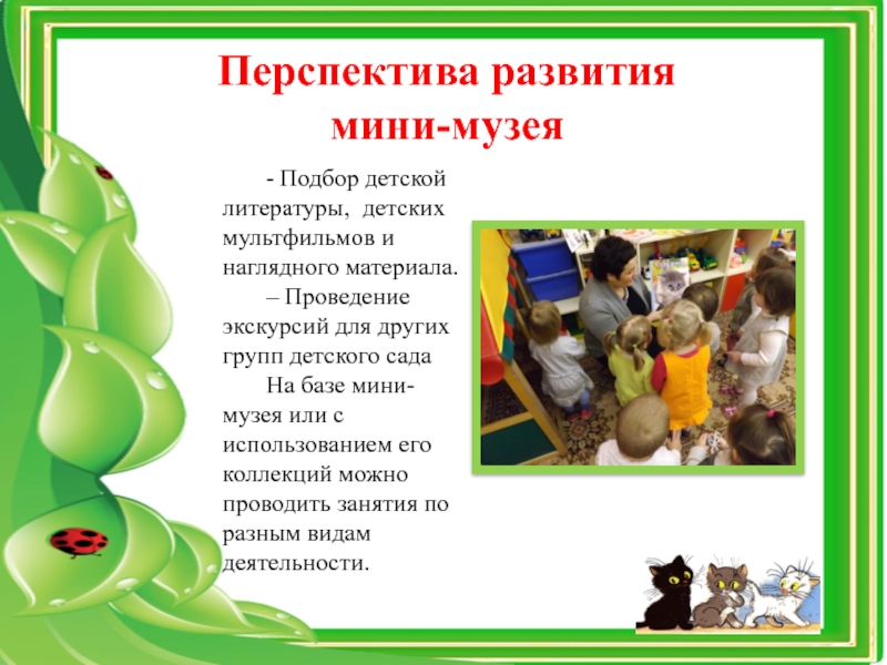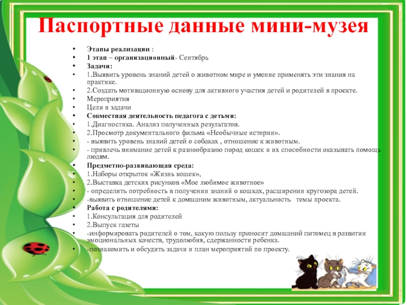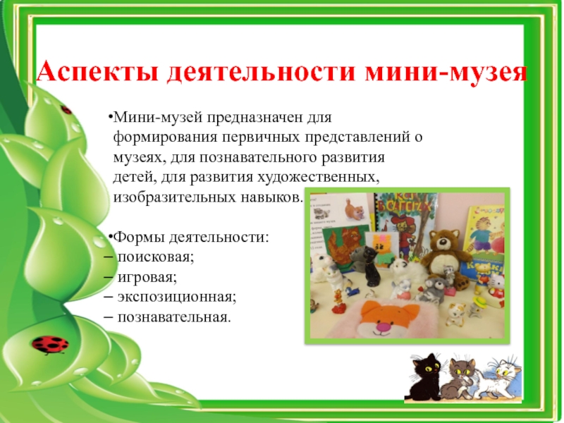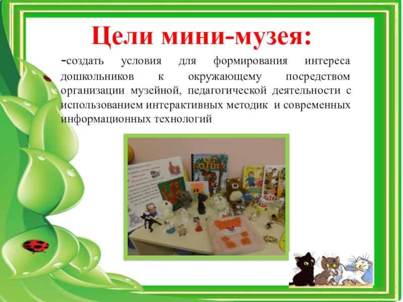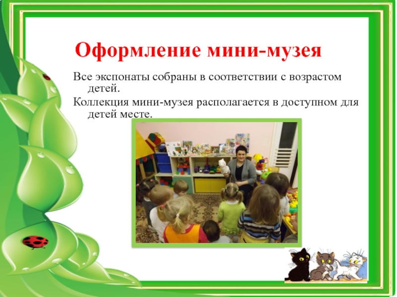 Оформление мини-музея: музейные экспонаты собраны в соответствии с возрастом детей. Коллекции мини-музея располагаются на полках стенки в групповой комнате. Например, коллекции игрушек-кошек (мягких, резиновых, пластмассовых) располагаются на нижней полке стенки, поэтому всегда доступны для детских игр. Коллекция фигурок из различных материалов (яичная скорлупа, слоеное тесто, масса для лепки, гипс), картины в рамках стоят на верхней полке в целях безопасности и используются при работе с детьми только совместно с воспитателем. На нижней полке представлена детская литература, подборки картинок о кошках, дидактические игры с фотографиями кошек.