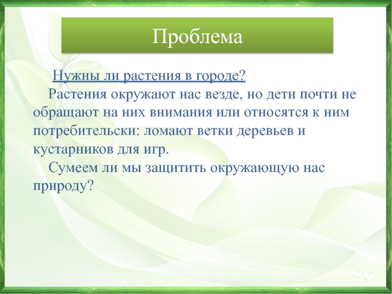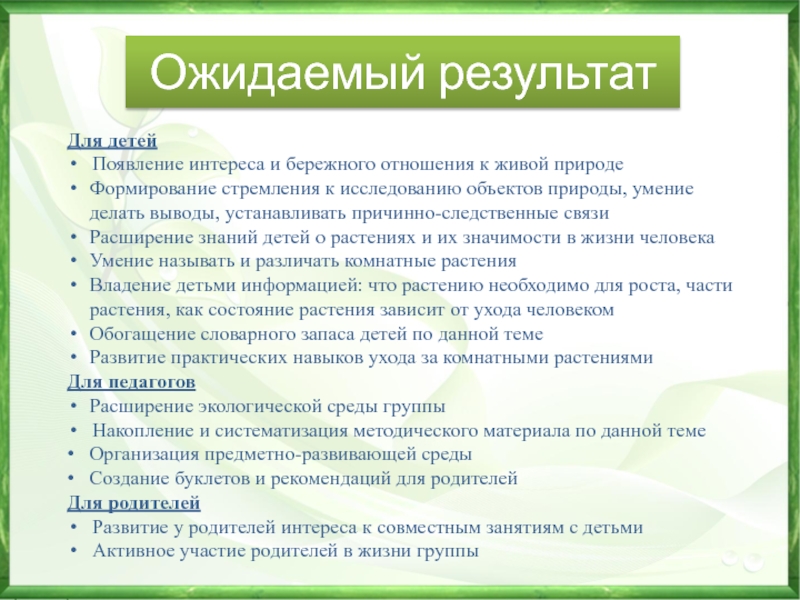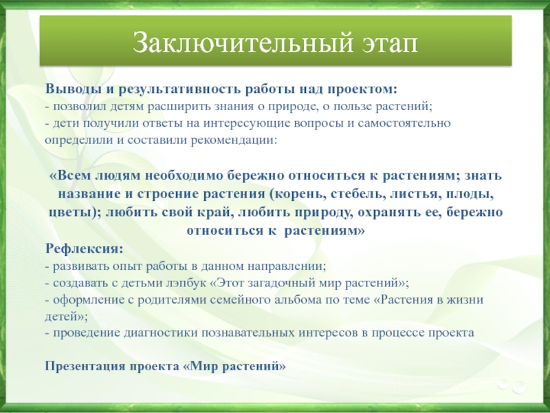 «Всем людям необходимо бережно относиться к растениям; знать название и строение растения (корень, стебель, листья, плоды, цветы); любить свой край, любить природу, охранять ее, бережно относиться к растениям»
