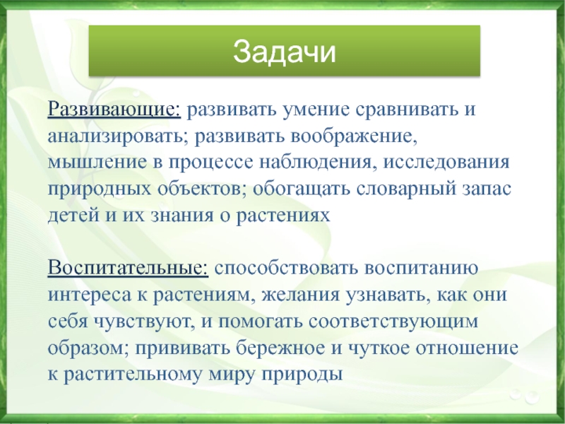 Воспитательные: способствовать воспитанию интереса к растениям, желания узнавать, как они себя чувствуют, и помогать соответствующим образом; прививать бережное и чуткое отношение к растительному миру природы