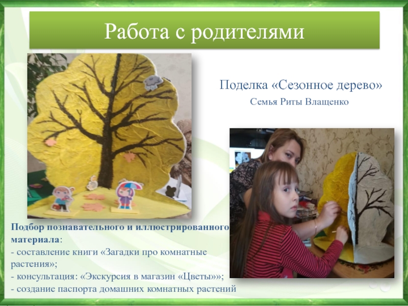 - создавать с детьми лэпбук «Этот загадочный мир растений»; - оформление с родителями семейного альбома по теме «Растения в жизни детей»;
