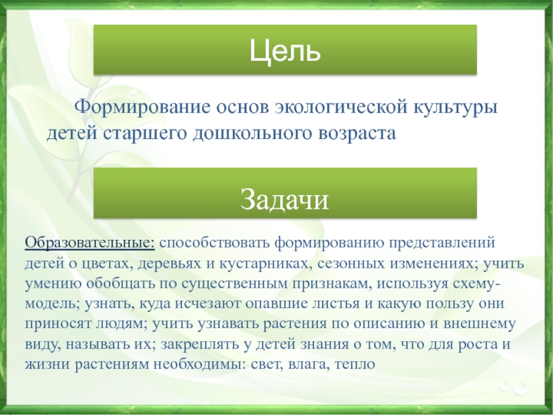 представлений детей о цветах, деревьях и кустарниках, сезонных изменениях; учить умению обобщать по существенным признакам, используя схему-модель; узнать, куда исчезают опавшие листья и какую пользу они приносят людям; учить узнавать растения по описанию и внешнему виду, называть их; закреплять у детей знания о том, что для роста и жизни растениям необходимы: свет, влага, тепло