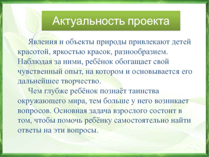 Чем глубже ребёнок познаёт таинства окружающего мира, тем больше у него возникает вопросов. Основная задача взрослого состоит в том, чтобы помочь ребёнку самостоятельно найти ответы на эти вопросы.