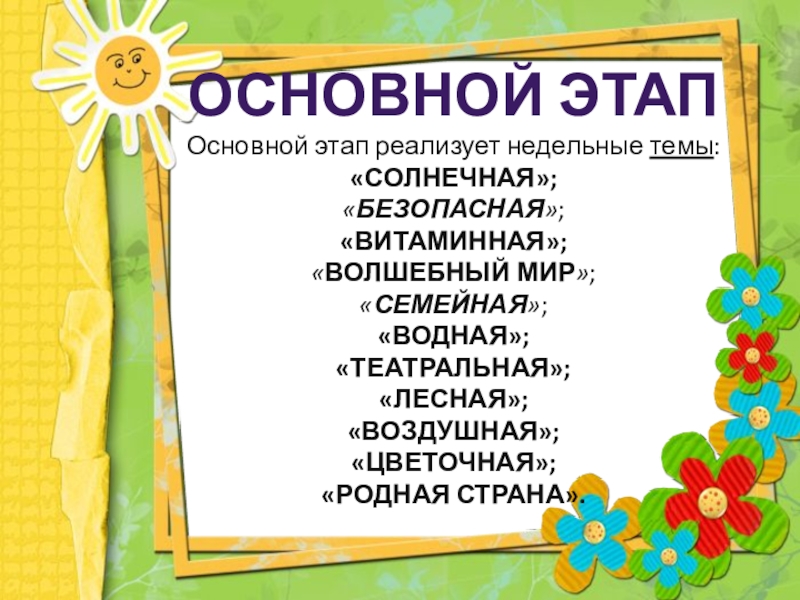 Основной этап реализует недельные темы: