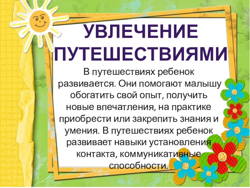 получить новые впечатления, на практике приобрести или закрепить знания и умения. В путешествиях ребенок развивает навыки установления контакта, коммуникативные способности.