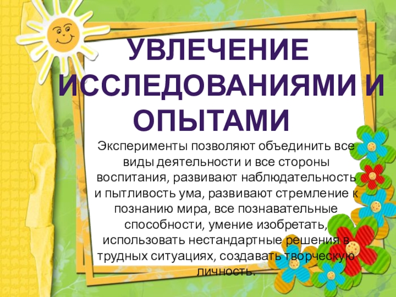 Эксперименты позволяют объединить все виды деятельности и все стороны воспитания, развивают наблюдательность и пытливость ума, развивают стремление к познанию мира, все познавательные способности, умение изобретать, использовать нестандартные решения в трудных ситуациях, создавать творческую личность.