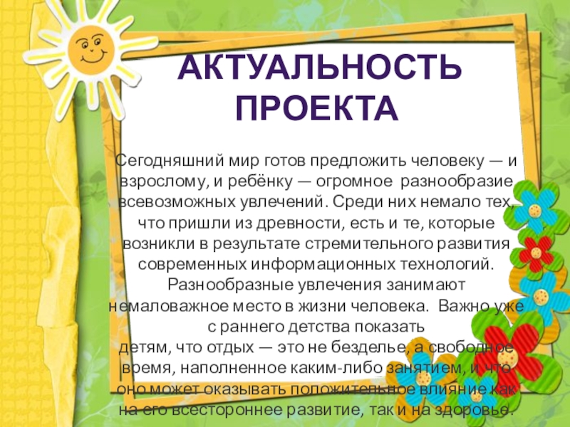 ребёнку — огромное разнообразие всевозможных увлечений. Среди них немало тех, что пришли из древности, есть и те, которые возникли в результате стремительного развития современных информационных технологий. Разнообразные увлечения занимают немаловажное место в жизни человека. Важно уже с раннего детства показать
