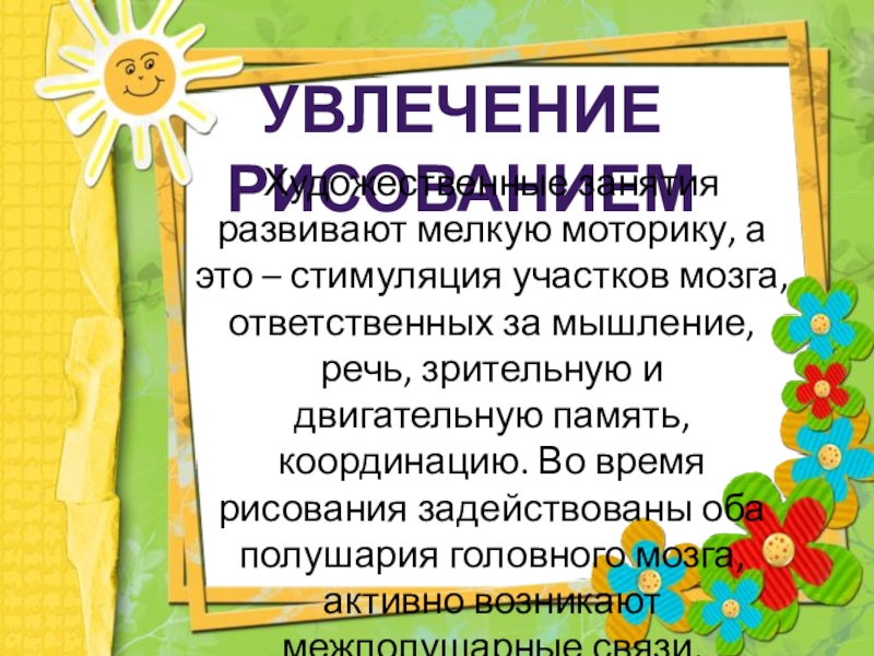 мозга, ответственных за мышление, речь, зрительную и двигательную память, координацию. Во время рисования задействованы оба полушария головного мозга, активно возникают межполушарные связи.